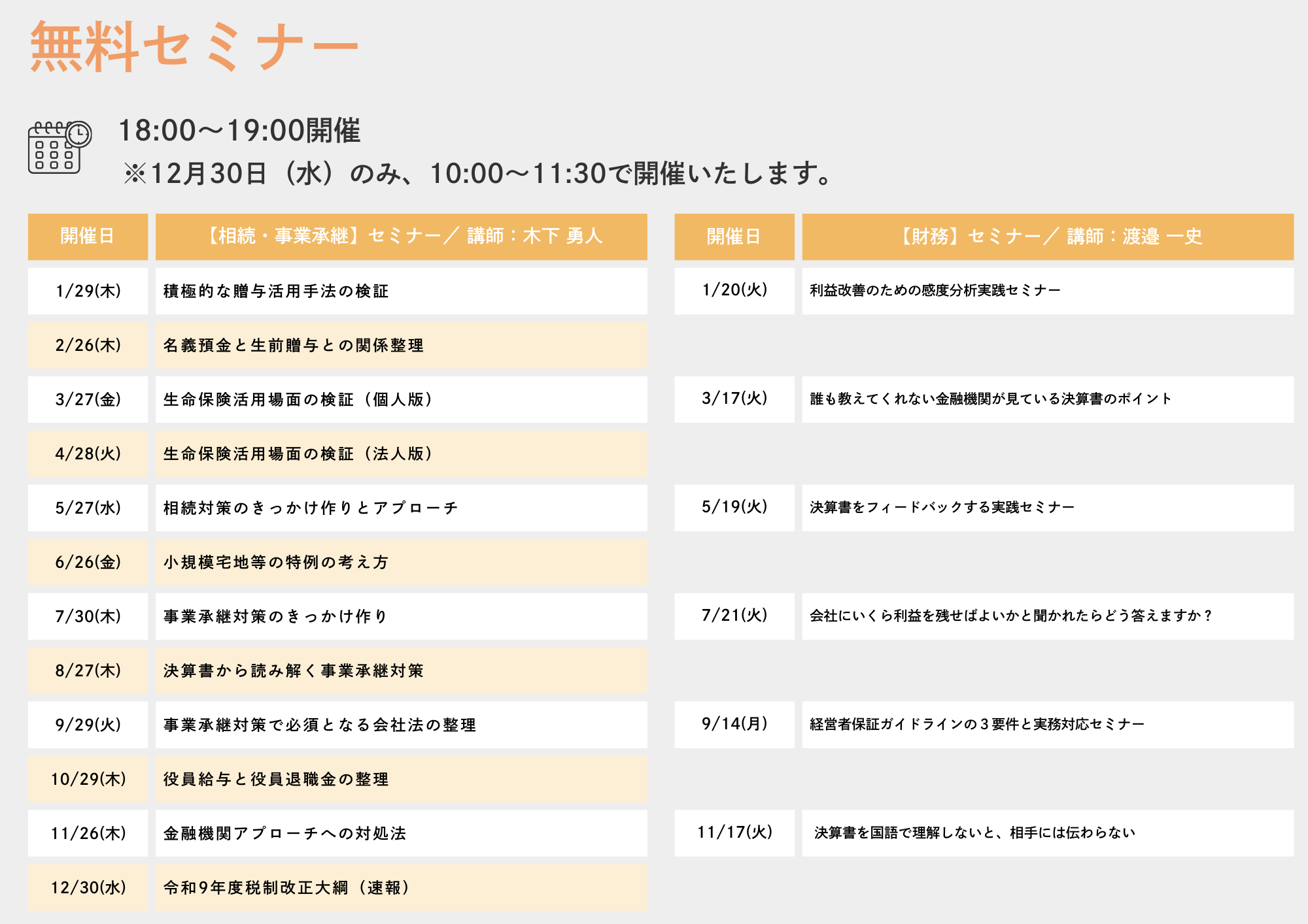 レディング事業承継・財務アカデミーの会員様が参加できるセミナー日程です。